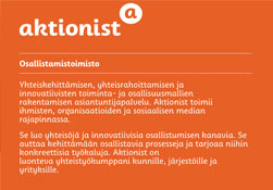 Yhteiskehittämisen, yhteisrahoittamisen ja innovatiivisten toiminta- ja osallisuusmallien rakentamisen asiantuntijapalvelu. Aktionist toimii ihmisten, organisaatioiden ja sosiaalisen median rajapinnassa.-Yhteistyössä Yhteismaa ry. & Dog Design -WordPress